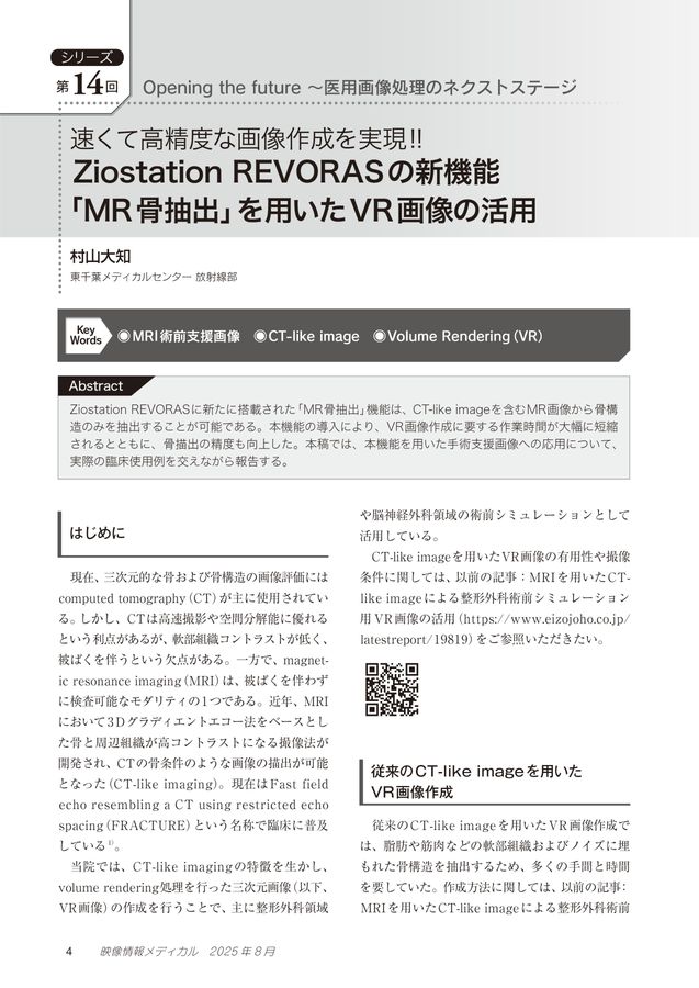 Ziostation REVORASに新たに搭載された「MR骨抽出」機能は、CT-like imMR画像から骨構造のみを抽出することが可能である。本機能の導入により、VR画像作成に要する作業時間が大幅に短縮されるとともに、骨抽出の精度も向上した。本稿では、本機能を用いた手術支援画像への応用について、実際の臨床使用例を交えながら報告する。