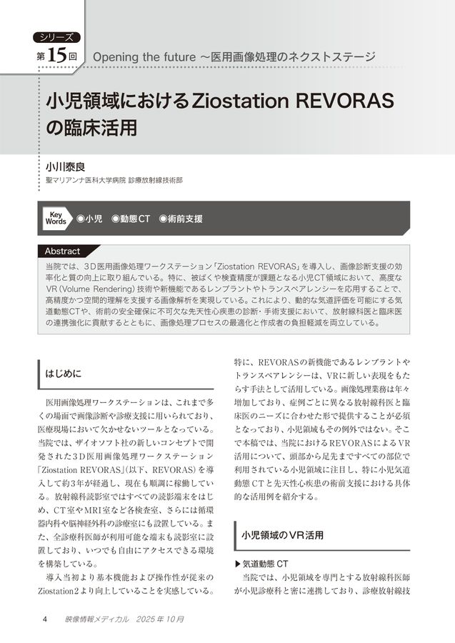 当院では、3D医用画像処理ワークステーション「Ziostation REVORAS」を導入し、画像診断支援の効率化と質の向上に取り組んでいる。特に、被ばくや検査精度が課題となる小児CT領域において、高度なVR(Volume Rendering)技術や新機能であるレンブラントやトランスペアレンシーを応用することで、高精度かつ空間的理解を支援する画像解析を実現している。これにより、動的な気道評価を可能にする気道動態CTや、術前の安全確保に不可欠な先天性心疾患の診断・手術支援において、放射線科医と臨床医の連携強化に貢献するとともに、画像処理プロセスの最適化と作成者の負担軽減を両立している。